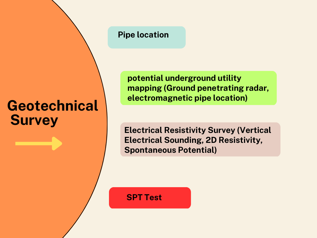 Tools: Total Station, Digital Level, Auto Level, Pipe Locator, GPR, Drone, Plotter, Printer, Scanner, Gouge Sampler, Extension Rods, Handle, Measuring Tape, Sleigh Range, Hexed Blade, PVC Pipe, Tripod, Header, Hammer, Hammer Platform, Hammer Rod, Daeknosky, Daeknosky Bulb, Shovel, Crowell, Monolith, Measuring Tape, Clinometer.